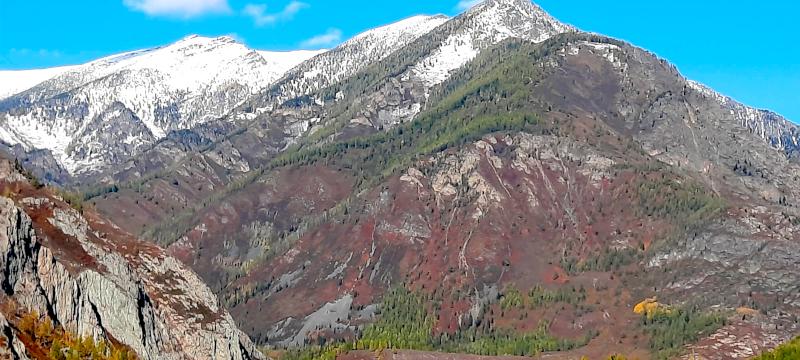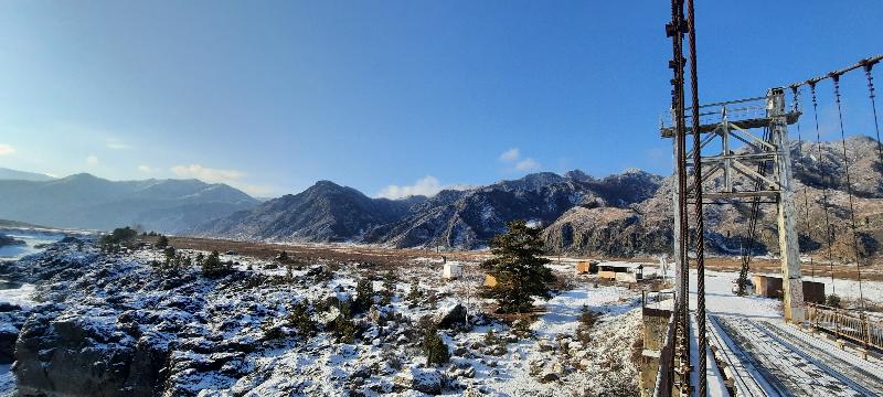 В зимнее время на Алтае открывается удивительный вид. Склоны гор укрыты снегом, но хвойные деревья сохраняют свою зелень, а лиственницы приобретают коричневый оттенок, создавая яркий контраст с белоснежным покровом.